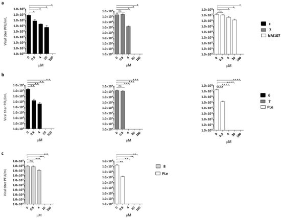 Antiviral activity was confirmed for three out of four of the described compounds in virus yield reduction assays (YRA) against Vero-76 and LLC-MK2 cells, as reported in Figure 2a–c. Derivatives 6–8 were selected as the most active out of the above-mentioned anti-EVs. Pleconaril (PLe) and NM107 (2′-C-methylcytidine), known as active against title viruses, were selected as positive reference compounds.