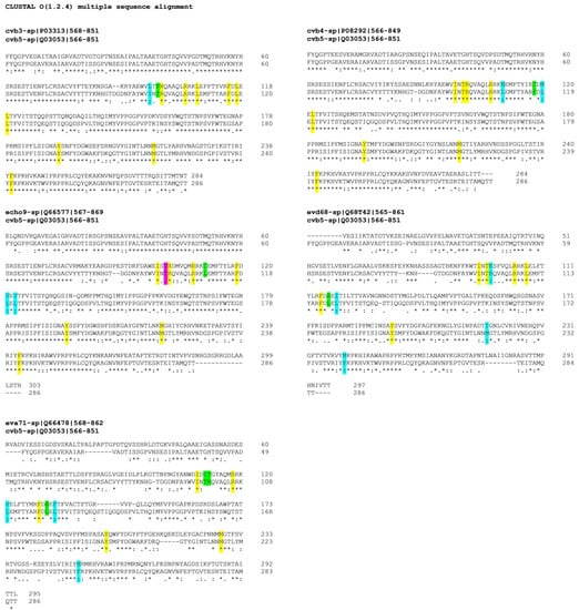 Protein sequence alignment was performed by using CLUSTAL OMEGA software (https://www.ebi.ac.uk/Tools/msa/clustalo/, last access: 9 October 2020) [30]. Protein sequences were acquired from theUniProt website (https://www.uniprot.org/, last access: 9 October 2020), and it should be highlighted that the CV-B5-VP1 deposited sequence had anamino-acid numbering increase of 3 units.