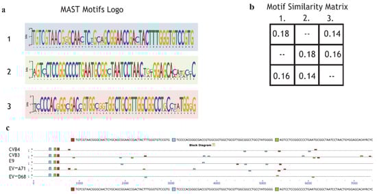Motif de novo sequences: Motif logo of repetitive elements present in the genome of CVB4, CVB3, E9, EV-A71, and EV-D68. (a); Motif similarity matrix computes the pairwise correlations between each pair of motifs. The correlation between two motifs is the maximum sum of Pearson’s correlation coefficients for aligned columns divided by the width of the shorter motif. The maximum is found by trying all alignments of the two motifs (b). (c) Graphical representation of all virus genomes and the presence of motifs with the respective position across the genome.