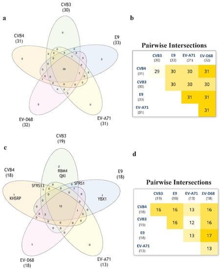 Aiming to develop further broad-spectrum antivirals, we wantto focus our future research on RNA in order to identify new targets for thedevelopment ofnew antivirals [17]. For this purpose, we performed an RNA-binding motif analysis via RNA-Binding Protein DataBase (RBPDB) [18] scan. We wanted to find any RNA-binding motifs that CVB3, CVB4 could have in common if compared to E9, EV-D68, and EV-A71. RBPDB is a database of RNA-binding specificities (http://rbpdb.ccbr.utoronto.ca/, last access: 4 April 2020) [18]. With this bioinformatic analysis, we obtained the full list of predicted motifs in all the input sequences. The first scan returned 4225 binding sites; 463 had a 100% similarity. The list was then represented in a Venn diagram. InteractiVenn offers a clean interface to build a diagram.