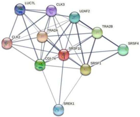 InteractiVenn extends the ability to analyze combinations of sets of elements in part or in total, affording additional observations of the interactions between joined sets. The results are shown in Figure 6. Pairwise intersection analysis showed that the five enteroviruses share 29–31 binding motifs with a relative score greater than 80% (Figure 6a,b). A more accurate scan (default thresholds of 100%) revealed that CVB3, CVB4, E9, EV-D68, and EV-A71 have 12 sequences in common (Figure 6c,d). Interestingly, the SFRS13 sequence (a.k.a. FUSIP2, SFRS13A, TASR, SRSF10) is shared by only CVB3 and CVB4. According to the UniProt database, SFRS13 is a typical human sequence encoding for the serine/arginine-rich splicing factor 10, which is involved in mRNA processing [19,20]. In detail, when dephosphorylated (after heat shock, DNA damage, and during mitosis), it represses pre-mRNA splicing and allows exon skipping during alternative splicing. SRFS10 protein interacts with many SR, hnRNP, and kinase proteins (Figure 7) involved in mRNA splicing, processing, and stability. In particular, TRA2β, TRA2α, and U2AF2 are involved in pre-mRNA splicing; YTHDC1 and SRSF4 are alternative splicing regulators; CLK3 phosphorylates SRSF1. Thus, a change in those interactions could lead to different splicing and different transcription.