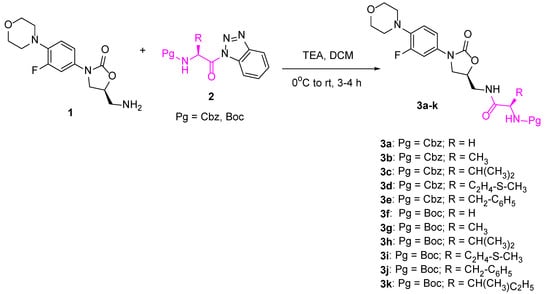 The current study is focused on synthesizing some linezolid conjugates 3a–k by reacting linezolid 1 with benzotriazole-activated protected amino acids 2a–k in dichloromethane (DCM) containing triethylamine at 0 °C for 3–4 h (Scheme 1).