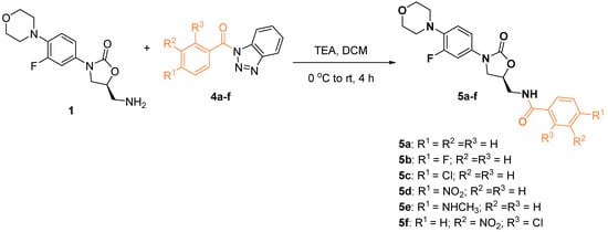 Synthesis of linezolid-aromatic acid conjugates 5a–f.