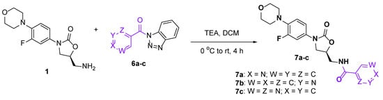Synthesis of linezolid-heteroaromatic acid conjugates 7a–c.