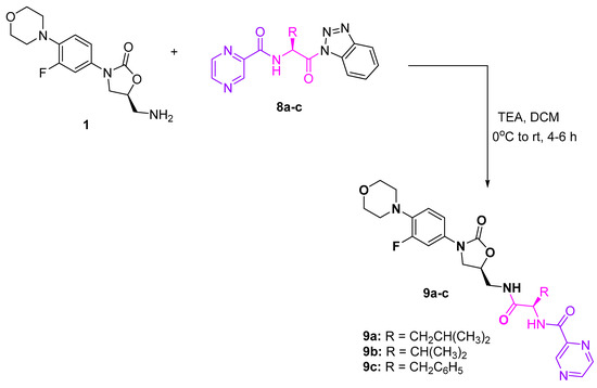 To synthesize a set of hybrid conjugates of linezolid, amino acid, and heteroaromatic acid, we treated benzotriazole-activated pyrazinoic acid-amino acid conjugate 8a–c (which we reported in our previous report []) in DCM in the presence of TEA at 0 °C for 4–6 h (Scheme 4).