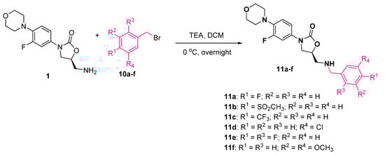 Different substituted benzyl halides 10a–f (1.2 eq.) were added to a solution of deacetyl linezolid 1 (500 mg, 1.0 eq.) in anhydrous DCM (10 mL), in the presence of TEA (2.5 eq.) and chilled to 0 °C. The reaction mixture was stirred overnight, allowing the temperature to become room temperature; TLC monitored the progress of the reaction. After completion of the reaction, the solvent was evaporated under reduced pressure and the residue was treated with a few crystals of ice and 10 mL of 10% NaOH solution. The crude product was extracted with ethyl acetate (15 mL) three times and was then purified by column chromatography (1% MeOH in DCM) to get the desired products 11a–f in pure form.