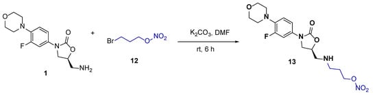 To introduce the nitrogen-releasing component in the linezolid conjugate, we reacted linezolid 1 with 3-bromopropyl nitrate 12 in DMF in the presence of potassium carbonate (K2CO3) at room temperature for 6 h (Scheme 6).