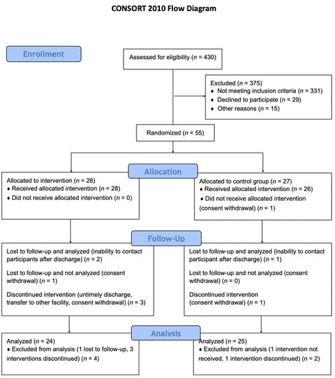 A total of 430 patients were assessed for eligibility in this study. After applying exclusion criteria 55 patients were randomized, and 49 were included in the final analysis (24 allocated to the intervention group and 25 allocated to the control group), Figure 1.