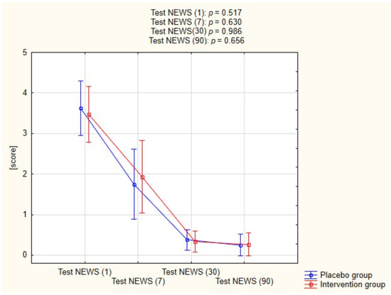 Figure 3 shows the progression NEWS test scores in both groups acquired at different time points, the difference between the two groups was not statistically significant at any given timepoint.