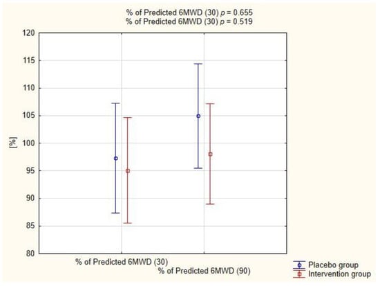 Figure 4 shows the percent of predicted 6-min walk distance in both groups at two follow-up time points. The distances achieved during 6MWT did not differ significantly between the groups on both the 30th (p = 0.665) and the 90th day (p = 0.519).