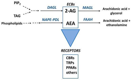 The two main receptors for ECBs are the G-coupled proteins Cannabinoid Type 1 (CB1R) and Cannabinoid Type 2 (CB2R) receptors. However, ECBs can also bind to transient receptor potential (TRP) cation channels, peroxisome proliferator-activated receptors (PPARs) and ligand-activated ion channels for neurotransmitters such as serotonin (e.g., 5-HT1A, 5-HT2A and 5-HT3) [27]. In the ‘classical signaling pathway’, the binding of the CNB to CB1R/CB2R changes the receptors from an inactive to an active conformation, causing the dissociation of the Gα subunit of the G protein from the CBR and the Gβγ dimer. The Gα subunit then inhibits adenylate cyclase and the cAMP-dependent pathway. The dimer Gβγ, on the other hand, regulates mitogen-activated protein kinases (MAPKs) [32]. Endocannabinoids are lipid derivatives, thus they cannot be stored in vesicles and seem to be synthesized “on-demand” [33]. Phospholipids are the precursors of AEA, which is biosynthesized from these compounds via several different pathways, the main involving the enzyme N-acylphosphatidylethanolamine-phospholipase D (NAPE-PLD) [34]. This ECB is mainly metabolized by fatty acid amide hydrolase (FAAH), a membrane enzyme, to AA and ethanolamine [35]. The biosynthesis of 2-AG involves a signaling pathway starting with phosphatidylinositol-4,5-bisphosphate (PIP2), and a metabolic pathway from sn2-arachidonate-containing triglycerides. The main biosynthetic enzyme, converting diacylglycerol (DAG) into 2-AG, is diacylglycerol lipase (DAGL). Although there are several metabolic pathways for 2-AG, the predominant pathway consists of the hydrolysis of the ester bond into AA and glycerol, catalyzed by monoacylglycerol lipase (MAGL) (Figure 2) [36].
