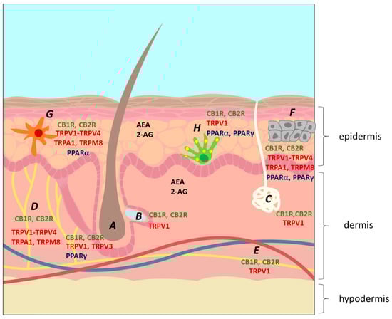 The location of the endocannabinoid system on the skin. A, hair follicle; B, sebaceous gland; C, sweat gland; D, nerve; E, blood vessels; F, keratinocytes; G, Langerhans cell (immunocyte); H, melanocytes. The figure shows the location of the two main ECBs, 2-arachidoynyl-glycerol (2-AG) and anandamide (AEA), and of several ECB receptors, including the main cannabinoid receptors CB1R and CB2R, several transient potential ion channel receptors (TRPs) and peroxisome proliferator-activated receptors (PPARs) [26].