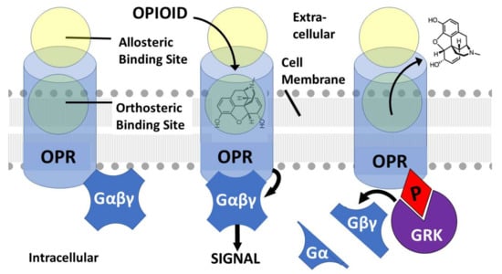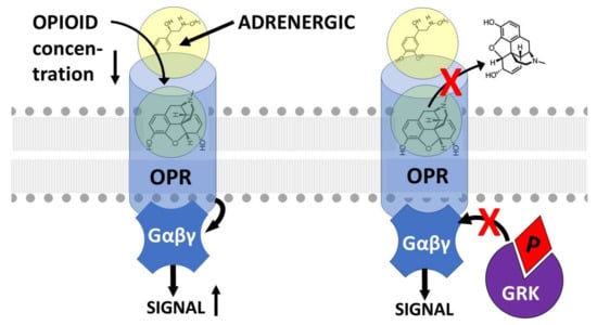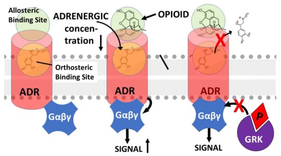 Both opioid and adrenergic receptors belong to the broad class of G-protein coupled receptors (GPCR) that are activated by binding an appropriate ligand into their highly specific orthosteric binding site. Orthosteric ligand binding results in a conformational change in the receptor that allows an intracellular guanine nucleotide-binding protein (G protein) to exchange a guanine diphosphate (GDP) for a guanine triphosphate (GTP), the GTP then permitting one of the G protein subunits to dissociate and act as an intracellular second messenger to activate downstream functions. The dissociation of the G protein also activates the phosphorylation of the remaining subunits by G protein-coupled receptor kinases (GRKs), which results in the internalization of the receptor, and thus the downregulation of receptor activity. Repeated or continuous stimulation of GPCR results in tolerance to the ligand as a result of this downregulation so that increasing concentrations of drug are needed to produce the previous effect [69].