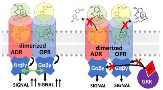 - Jordan, B.A.; Trapaidze, N.; Gomes, I.; Nivarthi, R.; Devi, L.A. Oligomerization of opioid receptors with beta 2-adrenergic receptors: A role in trafficking and mitogen-activated protein kinase activation. Proc. Natl. Acad. Sci. USA 2001, 98, 343–348. [Google Scholar] [CrossRef] [PubMed]