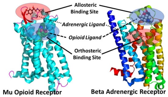 Ribbon models of the mu opioid receptor (MOR) and the β adrenergic receptor (Wikimedia Commons) illustrating the locations of the orthosteric and allosteric binding sites on each based on the references provided in this paper in Section 2. The proximity of the allosteric site to the orthosteric site in both types of receptors means that bitopic opioid–adrenergic drugs will have relatively short tethers. The degree to which a tethered heterobitopic compound will orient the adrenergic and opioid components relative to each other so that they are specific for either opioid receptors or adrenergic receptors or both is as yet unknown and probably depends on the attachment site of the linker to each component as well as the flexibility of the linker.