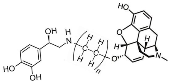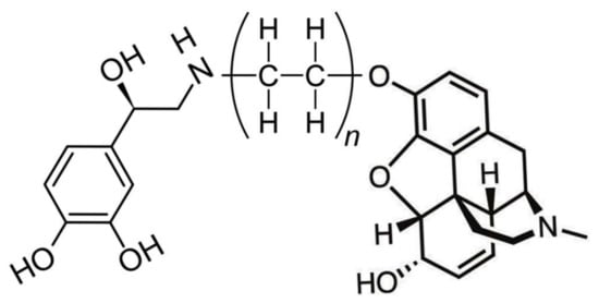 Bitopic compounds that increase GPCR receptor selectivity by linking a compound that binds to the orthosteric site with another that binds to the allosteric site have previously been designed and tested successfully (reviewed in [74,76,124]). In particular, homobitopic compounds (composed either of agonists or antagonists) that take advantage of the metastable binding site have successfully been designed for adrenergic receptors [94,125,126] and, separately, for opioid receptors [127,128,129,130]. Additionally, some bitopic opioid compounds with improved specificity for mixed-action KOR/MOR have been produced [131] and for MOR [132,133] as well as bitopic adrenergic compounds with similarly improved specificity [71,74,94,134]. However, it appears that heterobitopic ligands involving combinations of opioids and adrenergics have not yet been synthesized or tested. Thus, the mutual opioid–adrenergic enhancement mechanisms described above have not yet been exploited for their full pharmaceutical potential and therein lies the novel potential of bitopic, tethered opioid–adrenergic compounds.