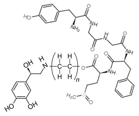 An example of a bitopic adrenergic-opioid tethered drug. The adrenergic module (left) is epinephrine. The opioid module (right) is methionine enkephalin. The tether (center) is polyethylene. This structure illustrates the fact that endogenous opioid such as the enkaphalins and their modified versions (e.g., D-Ala2, N-MePhe4, Gly-ol]-enkephalin [DAMGO]) may also provide the basis for novel, biased, and enhanced tethered drugs.