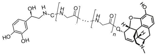 Tethered opioid–adrenergic bitopic allosteric modulators will take advantage of the proximity of the orthosteric and allosteric binding sites that are present in both the opioid and adrenergic receptors (Figure 5). Because these binding sites are close together, tethers may be only a few atoms in length, as is illustrated by 17-cyclopropylmethyl-3,14β-dihydroxy-4,5α-epoxy-6β- [(2′-indolyl)acetamido]morphinan (INTA), a morphine agonist potentiated by conjugation to an indole moiety that showed potent antinociception and had no tolerance, dependence, and aversive effects in the conditioned place preference assay [132,133]. Evidence from homobitopic opioid and adrenergic compounds also suggests that tethers are likely to be short, consisting of only a few atoms in length [74,132,133,134,135]. Examples of such tethers include polyethylene glycol (PEG) [114,136,137], or short peptides such as polyproline [138] and polyglycine [139] or their modifications [139], usually two or three amino acids in length. Fultonet al. [139] demonstrated that adding hydroxyl groups to hydrocarbon-based linkers significantly improved binding of divalent, tethered compounds while Deckeret al. [128] found that adding methyl groups adjacent to the hydrolytically labile ester linkage increased stability. Additionally, calculations by Bobrovnik [140] strongly suggest that flexible linkers are likely to produce far greater increases in bivalent ligand binding at low concentrations of the tethered drug than can be achieved either by rigid linkers or by exposure of the receptor to each the ligand and enhancer separately. Obviously, an almost unlimited number of permutations of simple, flexible polymers with hydroxyl and methyl groups in appropriate places that are tailored to, and optimized for, particular GPCR are possible and it is clear from existing examples that some of these produce better receptor activation and stability than others [74,114,124,132,133,134,135,136,137,138,139,140]. Figure 6 and Figure 7 provide examples of possible heterobitopic opioid–adrenergic agonist compounds utilizing morphine or methionine-enkephalin as the opioid agonists and epinephrine as the adrenergic agonist. While peptide opioids, such as the enkephalins, may not themselves be useful as therapeutics, they have been used successfully as components of bitopic compounds [107,141] for investigative purposes, and more stable versions, such as D-Ala2, N-MePhe4, Gly-ol]-enkephalin (DAMGO), may provide better medicinal chemistry options.