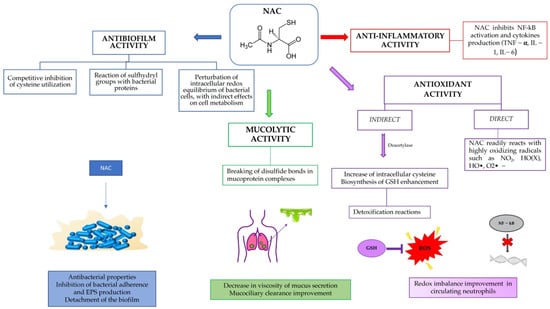 The aim of this review was to show the potential of a well-known and safe molecule, such as N-acetylcysteine, in preventing and eliminating biofilms, as a modulator of inflammation and as an antioxidant, restoring the redox balance within the airways in CF patients (Figure 1).
