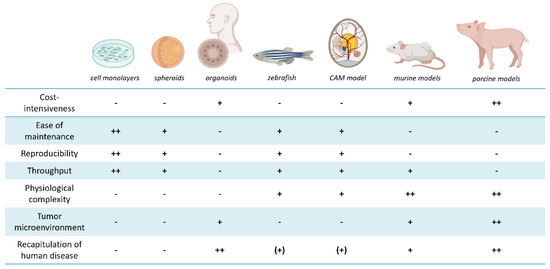 Key aspects of the described in vitro and in vivo models are summarized. The models were rated relative to each other in different categories. Relative scores are presented as best suited ++, suited +, partly suited (+) and not suited −. For example, costs (initial outlay and maintenance costs), as well as care-intensiveness, may play a critical role in the selection of the model. Animal models are generally more laborious and demanding in terms of equipment and care than in vitro models. However, the generation and maintenance of human organoid cultures are relatively expensive as they require specialized reagents and growth factors. The reproducibility of results highly depends on the grade of standardization of an assay or experiment. Cell experiments using 2D cultures can be performed easily in a standardized manner, while experiments based on human material or living organisms usually have higher variability. At the same time, it is hardly feasible to handle large cohorts or sample sizes when experimenting with large animals or very sophisticated models. The translational value of a model not only depends on the physiological complexity or used species but also if the chosen model organism to be engrafted is immunocompromised or immunocompetent, enabling to study the tumor microenvironment. In the context of personalized medicine, patient-derived organoid cultures or PDX animal models recapitulate human disease more accurately than immortalized cell lines or murine xenograft models of those. The figure was partly created with BioRender.com.