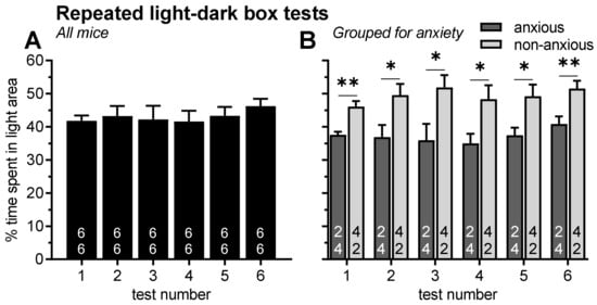 2.3. Stress-Induced Anxiety in the Light–Dark Box Test