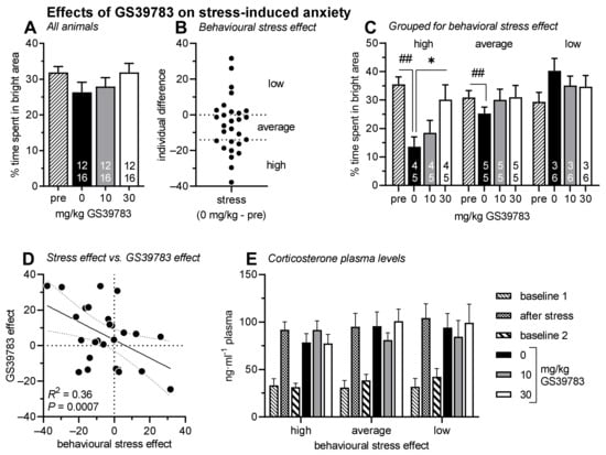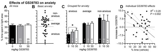 Chicago/Turabian StyleBicakci, Ahmet Oguzhan, Mousumi Sarkar, Yu-Hsin Chang, Evelyn Kahl, Lorenzo Ragazzi, Angel Moldes-Anaya, and Markus Fendt. 2022. "Anxiolytic-like Effects of the Positive GABAB Receptor Modulator GS39783 Correlate with Mice’s Individual Basal Anxiety and Stress Reactivity" Pharmaceuticals 15, no. 2: 233. https://doi.org/10.3390/ph15020233