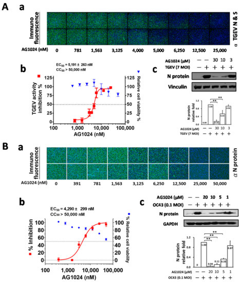 2.1. Tyrphostin AG1024 Inhibited TGEV and HCoV-OC43 Coronaviral Activities