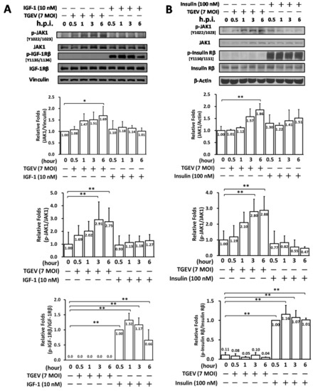 TGEV infection did not activate IR/IGF-1R signaling but induced JAK1 activation in the ST cell. ST cells were infected by TGEV at an MOI of 7 or respectively stimulated with IGF-1 (10 nM) (A) or insulin (100 nM) (B). The resulting cell lysates, harvested at the indicated time points of 0.5 h, 1 h, 3 h, and 6 h, were subjected to western analyses with antibodies against p-JAK1, JAK1, p-IGF-1R, IGF-1R, p-insulin R, insulin R or the internal loading controls vinculin or β-actin, respectively. *, p < 0.05; **, p < 0.01. Results shown are averages ± SD from three independent experiments.