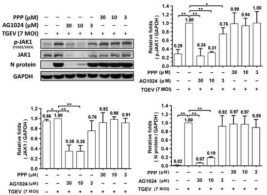 AG1024 diminished TGEV induced JAK1 activation/phosphorylation and inhibited TGEV activity in a dose-dependent manner. ST cells were pretreated with various concentrations of AG1024 or PPP respectively for 1 h prior to infection by TGEV at an MOI of 7. The resulting cells were harvested at 6 h.p.i. and then subjected to western analyses with antibodies against p-JAK1, JAK1, N, or an internal loading control GAPDH, respectively. *, p < 0.05; **, p < 0.01. Results shown are averages ± SD from three independent experiments.