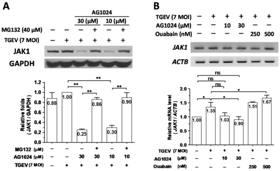 Previously, we reported that ouabain downregulates JAK1 protein levels through a proteolysis mediated by activating the Ndfip1/2_NEDD4 E3 ligase cascade [8]. Therefore, we wondered whether this mechanism could also account for AG1024 induced JAK1 proteolysis. In TGEV-infected and AG1024 (30 M and 10 M) treated ST cells, JAK1 protein levels were decreased to about 25–30% of their levels compared to TGEV-infected but AG1024-untreated cells, a decrease of about 70–75%. After TGEV infection, AG1024-treated cells further treated with the proteasome inhibitor MG132 restored JAK1 protein levels from ~25–30% back to ~90% (Figure 4A). On the other hand, whereas JAK1 transcription increased by ~35% in ST cells upon TGEV infection compared to uninfected control (Figure 4B), JAK1 protein levels only increased by about ~10% (Figure 4A), and AG1024 treatment reduced transcription from ~135% back to ~100%, the level of uninfected control (Figure 4B).
