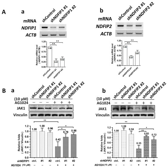 Ndfip1/2 were associated with AG1024 induced JAK1 diminishment. (A) The mRNA expression of either Ndfip1 (a) or Ndfip2 (b) were significantly depleted by gene silencing. The relative mRNA expression levels of Ndfip1 (a) or Ndfip2 (b) in ST cells harboring the respective Ndfip1-shRNA, Ndfip2-shRNA, or control shRNA are shown along with their respective quantitation as measured using semi-RT-PCR. (B) Depleting either Ndfip1 (a) or Ndfip2 (b) prevented the downregulation of the JAK1 protein level by AG1024 treatment. *, p < 0.05; **, p < 0.01. Results shown are averages ± SD from three independent experiments.