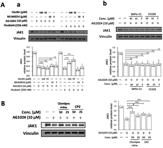 We next examined whether the NEDD4 inhibitor heclin could also restore JAK1 levels downregulated by AG1024 in a dose-dependent manner, as is the case for ouabain [8]. As expected, we found that heclin did restore JAK1 levels downregulated by ouabain, but not those downregulated by AG1024, Figure 6A(a).