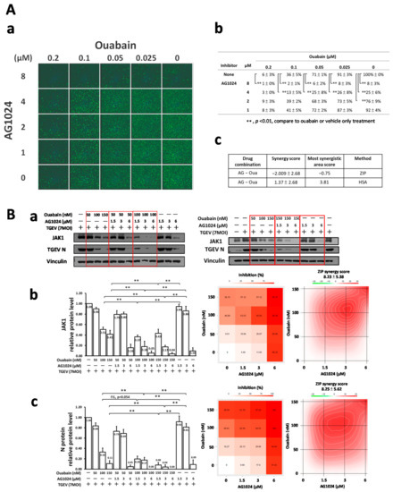 Additive effect of AG1024 and ouabain in anti-TGEV activity and JAK1-diminishment. (A) Combined treatment of AG1024 and ouabain profoundly and additively reduced TGEV infection as assayed by IFA in ST cells. (B) Combined treatments of AG1024 and ouabain additively diminish JAK1 protein levels. TGEV (MOI:7) infected ST cells were treated with compounds as indicated, and the resulting cells were subjected to IFA or harvested at 6 h.p.i. for subsequent western analyses. The results obtained from IFA (A(a,b)) or western B(a) were further analyzed by SynergyFinder(A(c),B(b,c)). **, p < 0.01. Results shown are averages ± SD from three independent experiments.