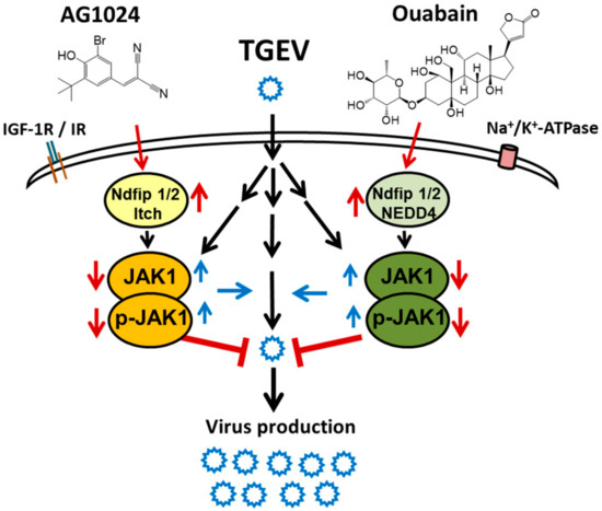 Herein, we report our discovery that AG1024 can inhibit coronaviruses and explore the underlying mechanism of action. Treatment of TGEV infected ST cells with AG1024 was found to activate a novel association of Ndfip1/2 with NEDD4-like E3 ligase Itch, and the subsequent JAK1 proteolysis/downregulation played a role in the IR/IGF-1R-independent anti-viral activity of AG1024.