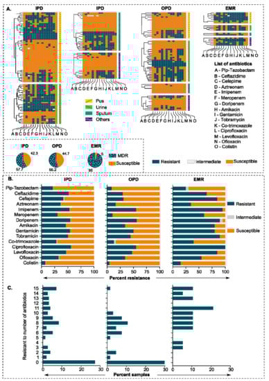 Antibiotic resistance pattern in clinical strains of P. aeruginosa. (A) Heatmap showing an antibiotic resistance pattern of 243 clinical strains of P. aeruginosa against 15 antipseudomonal antibiotics. IPD, OPD, and EMR represent Inpatient Department, Outpatient Department, and Emergency Department, respectively. The source of isolation is indicated on the left side of the heatmaps. (B) Percent resistance of all samples (clinical isolates) in different departments against 15 antipseudomonal antibiotics. (C) Bar graphs showing a frequency of the number of antibiotics against department-wise P. aeruginosa resistance percentage.