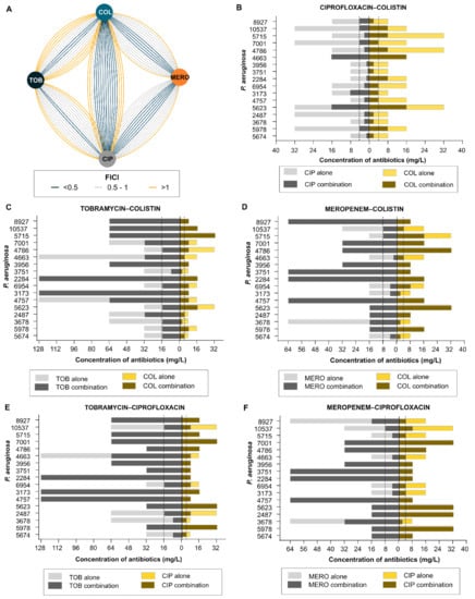 (A) Antibiotic–antibiotic interaction network of four antipseudomonal antibiotics (colistin, meropenem, ciprofloxacin, and tobramycin) in 17 extensive drug-resistant clinical strains of P. aeruginosa. Nodes represent different antibiotics, edges represent Fractional Inhibitory Concentration Index (FICI), i.e., synergy (FICI < 0.5; dark blue), partial synergy (FICI = 0.5–1; dashed gray), or no interaction (FICI > 1; yellow). Interaction network was created with Cytoscape version 3.8.0. (B) Minimum inhibitory concentration of ciprofloxacin–colistin; (C) tobramycin–colistin; (D) meropenem–colistin; (E) tobramycin–ciprofloxacin; (F) Meropenem–ciprofloxacin; alone (light gray and light yellow, respectively) or in combination (dark gray and dijon yellow, respectively) against 17 extensively drug-resistant clinical strains of P. aeruginosa. The dashed line represents the MIC breakpoint of respective antibiotics as defined by CLSI guidelines. The CLSI MIC breakpoint for P. aeruginosa resistance phenotype against ciprofloxacin, colistin, meropenem, and tobramycin is ≥4, ≥4, ≥8, and ≥16 mg/L, respectively [37].