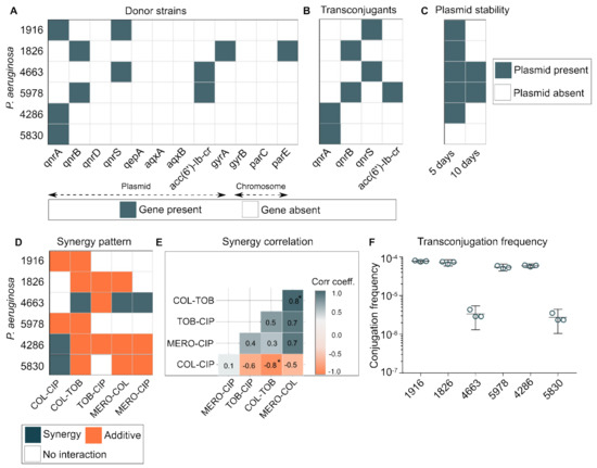 (A) Presence of quinolone resistance determinants in six P. aeruginosa strains. Twelve quinolone-resistant determinants were tested for their presence (qnrA, qnrB, qnrD, qnrS, qepA, aqxA, aqxB, aac(6′)-Ib-cr, gyrA, gyrB, parC, parE). (B) Four plasmid-mediated quinolone-resistant determinants genes (qnrA, qnrB, qnrS, and aac(6′)-Ib-cr) from clinical strains of P. aeruginosa were transferred to E. coli J53. (C) Inter-species plasmid stability in E. coli J53 after 5 and 10 days of transconjugation. (D) Antibiotic–antibiotic interaction pattern in six P. aeruginosa strains. (E) Antibiotic interaction correlation between five antibiotic interaction types displayed against six P. aeruginosa strains. The correlation matrix was computed using library (ggcorrplot version 0.1.3) in R. (F) Transconjugation frequency of six P. aeruginosa plasmids to E. coli J53. *: correlation significance value p < 0.05.