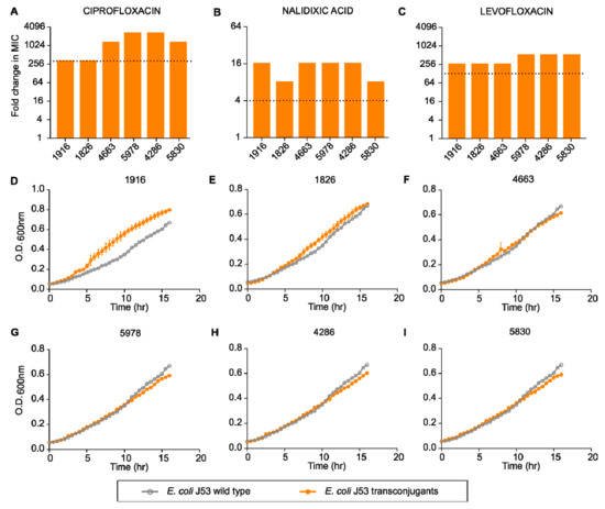 Fold change in minimum inhibitory concentration of different transconjugants compared to E. coli J53 against quinolones: (A) ciprofloxacin, (B) nalidixic acid, (C) levofloxacin. Relative growth of different transconjugants ((D) 1916, (E) 1826, (F) 4663, (G) 5978, (H) 4286, (I) 5830) compared to E. coli J53.