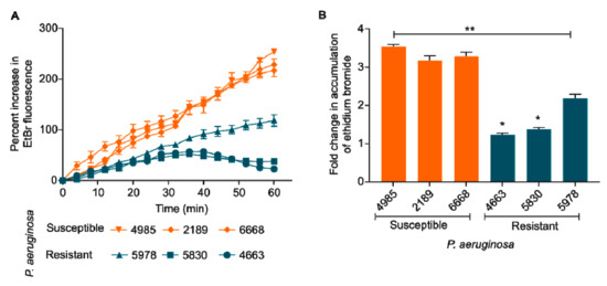Bacterial efflux pumps play a central role in antibiotic resistance. Our results indicated that quinolone-resistant P. aeruginosa has higher efflux activity than the susceptible counterpart. Ethidium bromide is a common substrate for many efflux pumps in Gram-negative bacteria, and its reduced uptake inside these bacterial cells is indirectly proportional to the efflux activity [39,40]. We found that quinolone-resistant P. aeruginosa (5978, 5830, and 4663) show reduced EtBr accumulation kinetics (i.e., higher efflux) as compared to quinolone-susceptible P. aeruginosa (4985, 2189, and 6668) (Figure 5A). More specifically, the resistant strains showed 1.5 to 3 times decreased EtBr accumulation (p < 0.05) than the susceptible P. aeruginosa (Figure 5B).