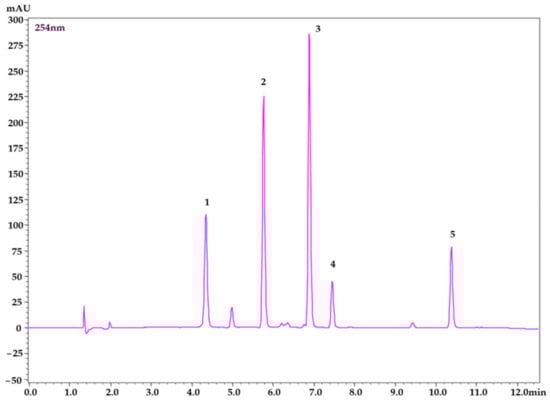 Chromatogram of mixed standard solution using YMC Triart C18 ExRS (150 × 4.6 mm, 5 µm particle size) at a universal wavelength of 254 nm. (1) chlorogenic acid, (2) rutin, (3) quercitrin, (4) phloridzin, (5) phloretin.