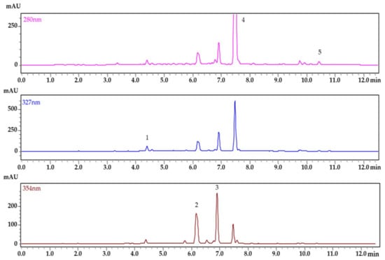 The developed and validated HPLC method was applied for the determination of phenolic compounds in the methanol extracts of apple leaves, bark, and buds. The profiles of the phenolic compounds in cvs. ‘Bohemia Gold’, ‘Fragrance’, ‘Gloster’, ‘Goldstar’, ‘James Grieve’, ‘Melodie’, ‘Melrose’, ‘Meteor’, ‘Průsvitné letní’, ‘Red Bilt’, ‘Rubinola’, ‘Spartan’, and ‘Topaz’ were evaluated. To show the analysis of the plant extract, a chromatogram of apple bark extract at different wavelengths according to the absorption maxima of the phenolic compounds is depicted in Figure 3.