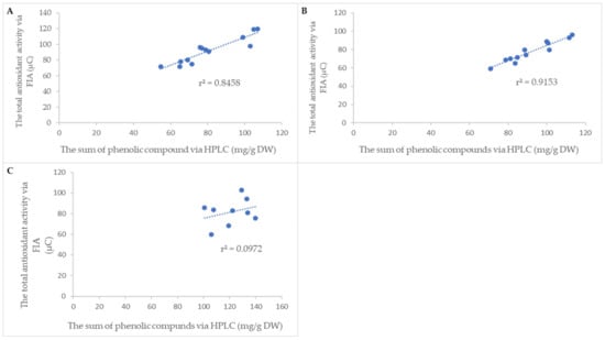 Relationship between the total antioxidant activity via FIA and the sum of phenolic compounds via HPLC in (A) leaves, (B) bark, and (C) buds.