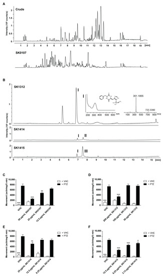 Among the antiseizure hits was MNP SK0107 (Figure 1A), one of the more polar fractions from the initial reversed-phase chromatographic separation of the crude extract of Aspergillus insuetus IBT 28443. SK0107 showed significant and concentration-dependent activity against PTZ-induced seizure behavior, as measured via automated video recording (ZebraBox, ViewPoint, Lyon, France) (Figure 1C).