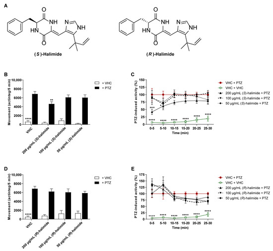 In this study, halimide was discovered as a scalemic mixture of the R- and S-enantiomer, based on the measurement of the optical rotation and Marfey’s analysis, which suggested a ratio of approximately 3:1 of the D- and L-phenylalanine residue. This is consistent with prior literature [24]. Separation of the two compounds was therefore performed by chiral HPLC, supported by measurement of the optical rotations and comparisons to literature [24], to enable the evaluation of each enantiomer individually. The antiseizure activity of the enantiomers was tested in the zebrafish PTZ seizure model after 2 h of treatment (Figure 4). (S)-Halimide significantly lowered PTZ-induced seizure behavior at 200 µg/mL (p ≤ 0.01, Figure 4B) during the 30 min recording period. A more detailed analysis of the behavior over consecutive 5 min time intervals revealed a significant reduction of PTZ-induced seizure behavior during the first 10 min (p ≤ 0.001 and p ≤ 0.05, Figure 4C) of recording. (R)-Halimide displayed no significant effect (Figure 4D,E). These data reveal that the activity of the scalemic mixture of halimide (3:1 R:S), as observed in Figure 3, is due to the S-enantiomer of halimide.