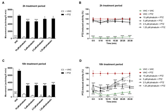 Behavioral antiseizure analysis of plinabulin after a short- and long-term treatment in the zebrafish PTZ seizure model. Antiseizure activity of plinabulin in the zebrafish pentylenetetrazole (PTZ) seizure model after a treatment period of 2 h (A,B) and 18 h (C,D). Behavioral data is expressed in mean actinteg units per 5 min (±SEM) during the 30 min recording period (A,C) and over consecutive 5 min time intervals (B,D). Data is normalized against the vehicle (VHC) + PTZ control condition (B,D). Data were pooled from ten independent experiments with 10 replicate wells per test condition (n = 100 for VHC + VHC and VHC + PTZ and n = 70 for plinabulin + VHC and plinabulin + PTZ) (A,B), and from three independent experiments with 10 replicate wells per test condition (n = 30) (C,D). Statistical analysis: one-way ANOVA with Dunnett’s multiple comparison test (A,C), two-way ANOVA with Dunnett’s multiple comparison test (B,D) (GraphPad Prism 9, San Diego, CA, USA). Significance levels: * p ≤ 0.05; ** p ≤ 0.01; *** p ≤ 0.001; **** p ≤ 0.0001.