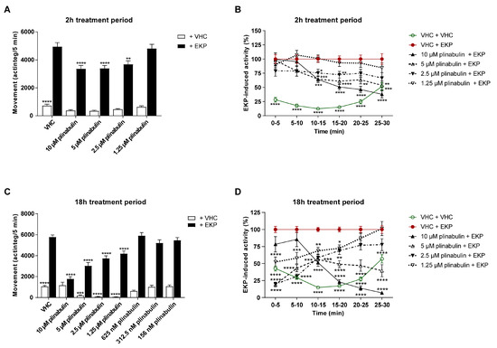 The antiseizure activity of plinabulin was investigated after both 2 h and 18 h periods of exposure. After the short-term treatment of 2 h, plinabulin significantly and concentration-dependently lowered EKP-induced seizure behavior at 10 µM (p ≤ 0.0001), 5 µM (p ≤ 0.0001), and 2.5 µM (p ≤ 0.01) during the 10–25 min recording period (Figure 7A). This period was selected from the 30 min recording, because EKP-induced seizure behavior was observed to be most pronounced during this time window. This behavioral trend is also clear from the more detailed analysis of the 30 min recording period in consecutive 5 min intervals (Figure 7B). After the long-term treatment of 18 h, plinabulin significantly and concentration-dependently lowered the EKP-induced seizure behavior at 1.25–10 µM during the 10–25 min recording period (p ≤ 0.0001, Figure 7C). The more detailed analysis of the 30 min recording period in consecutive 5 min intervals reveals that plinabulin is also active outside the 10–25 min window (Figure 7D). Again, the efficacy of plinabulin was more pronounced after the 18 h treatment compared to the 2 h treatment per and comparable to that of the positive control, perampanel (Figure S1C). However, after 18 h of exposure, the normal swimming behavior in the absence of EKP was also significantly lowered by 1.25–5 µM plinabulin (p ≤ 0.001 and p ≤ 0.0001), but not at higher or lower concentrations (Figure 7C).