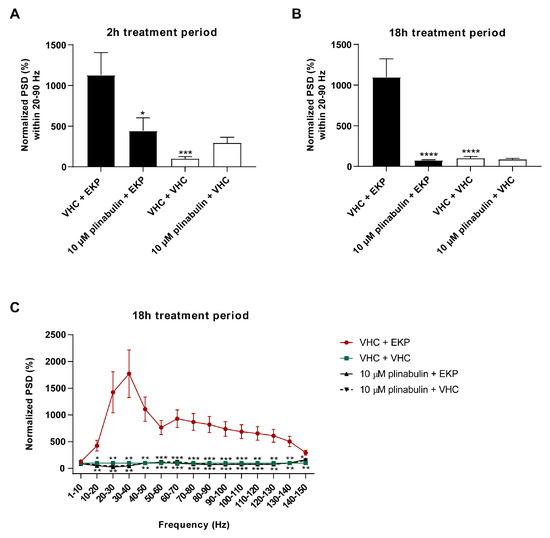 Electrophysiological antiseizure analysis of plinabulin in the zebrafish EKP seizure model after a short- and long-term treatment. Anti-epileptiform activity of plinabulin after 2 h (A) and 18 h (B,C) in the zebrafish ethyl ketopentenoate (EKP) seizure model. Electrophysiological data is normalized against the vehicle (VHC) + VHC control condition and expressed as normalized power spectral density (PSD) (mean ± SEM) per larva within the 20–90 Hz region (A,B) and as normalized PSD (mean ± SEM) per larva per 10 Hz frequency band from 1–150 Hz (C). Number of replicates per test condition was n = 13–16. Statistical analysis: one-way ANOVA with Dunnett’s multiple comparison test (A,B), two-way ANOVA with Dunnett’s multiple comparison test (C), outliers were removed via the ROUT test (Q = 1%) (GraphPad Prism 9, San Diego, CA, USA). Significance levels: * p ≤ 0.05; ** p ≤ 0.01; *** p ≤ 0.001; **** p ≤ 0.0001.