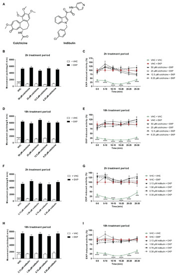 Plinabulin is currently being tested in clinical trials for different therapeutic indications in the field of cancer therapy [45,46]. Its mode of action has been shown to rely on the binding to β-tubulin, preventing the polymerization of tubulin [13,45,47]. To explore whether a similar mode of action could be responsible for its antiseizure activity, two additional microtubule destabilizing agents, colchicine and indibulin (Figure 9A), were tested in the larval zebrafish EKP seizure model to investigate if these functional analogues also possess antiseizure activity. Colchicine is used in clinical practices for the indication of gout [48], and indibulin is an anticancer agent used against advanced solid tumors [49].