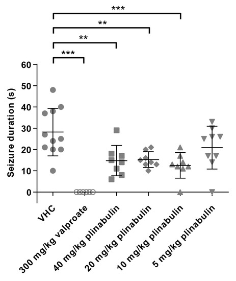 Male NMRI mice were intraperitoneally (i.p.) injected with a 50 µL volume (adjusted to the individual weight) of VHC (DMSO:PEG200 1:1), positive control valproate (300 mg/kg), or plinabulin (5, 10, 20, or 40 mg/kg) 30 min before electrical stimulation (Figure 10). VHC-injected mice showed characteristic seizure behavior with a mean (±SD) duration of 28 s (±11 s). In line with previous studies, mice that were injected with valproate were fully protected against the induced seizures [28,54], as none of the mice showed any seizure after electrical stimulation (p ≤ 0.001). Mice i.p. injected with plinabulin had a shorter seizure duration than the VHC control group, which was significant at 40 mg/kg (p ≤ 0.01, mean duration of 15 s (±7 s)), 20 mg/kg (p ≤ 0.01, mean duration of 15 s (±4 s)), and 10 mg/kg (p ≤ 0.001, mean duration of 12.5 s (±6 s)), but not at 5 mg/kg (mean duration of 21 s (±10 s)). Thus, the antiseizure activity of plinabulin that was observed in the larval zebrafish PTZ and EKP seizure models was observed to translate to a standard mouse model of drug-resistant focal seizures.