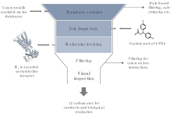 We started our in silico (Figure 3) workflow to design and evaluate carbamate-bridged compounds based on 4-FBA by preparing a narrowly focused library of commercially available diamines, with the structural prerequisite of one amine moiety being an aliphatic tertiary N-methyl amine enclosed in a cyclic structure. The rationale for this was three-fold: firstly, structural rigidification of the amine part of the molecule may lead to an increase in binding affinity by limiting the rotational freedom of this group. Secondly, due to the basicity of this structural element, the amine should, under physiological conditions, exist at least partly in its protonated form, thereby enabling the possibility of an ionic interaction with Asp1053.32 similar to tiotropium. Thirdly, considering the potential application as PET imaging probes, such compounds, contrasting cyclic tertiary amine structures such as quinuclidine, would be amenable to straightforward radiolabeling with carbon-11. More precisely, merging in-stock primary and secondary amines from Enamine with in-stock diamines from Chemspace led to the creation of a compound library counting 52,857 amines. After curating this library by, for example, salt-stripping and dropping duplicates, and applying the above elucidated filter criterion, undefined stereocenters were enumerated, resulting in a dramatically reduced selection of 331 diamine fragments. This selection was subsequently linked with 4-FBA’s eastern 4,4’-difluorobenzhydrol via a carbamate bridge and the resulting carbamates were set to their energetically most favorable ionization state at pH 7.4 and subjected to docking. To prioritize among the docked compounds, a distance filter has been used, dropping all poses whose cationic amine did not come within a distance of 5.5 Å to the Asp1053.32 carboxyl oxygens. Since the charge-charge interaction between Asp1053.32 and a ligand’s cationic head is not restricted to a distinct spatial point, the ammonium group’s position has some leeway []. The distance of tiotropium’s positively charged amine to the Asp1053.32 carboxyl oxygens is slightly below 5 Å, and for other known ligands, the distance is predicted to be in a similar range [,], hence a distance constraint of 5.5 Å was assumed to be reasonable. For each ligand–receptor complex, only the top ranked pose exhibiting an ionic interaction with Asp1053.32 according to LigandScout was selected as a representative [], leaving a final dataset of 129 potential ligands. Considering the approximate nature of docking scores and the corresponding interaction energies, compound ranking based on these metrices is insufficient []; instead, we visually inspected the remaining compounds and selected a set of 12 that interacted with similar residues as those predicted for 4-FBA, such as Cys4077.42, Tyr1063.33 and Thr1895.39 for further experimental validation [].